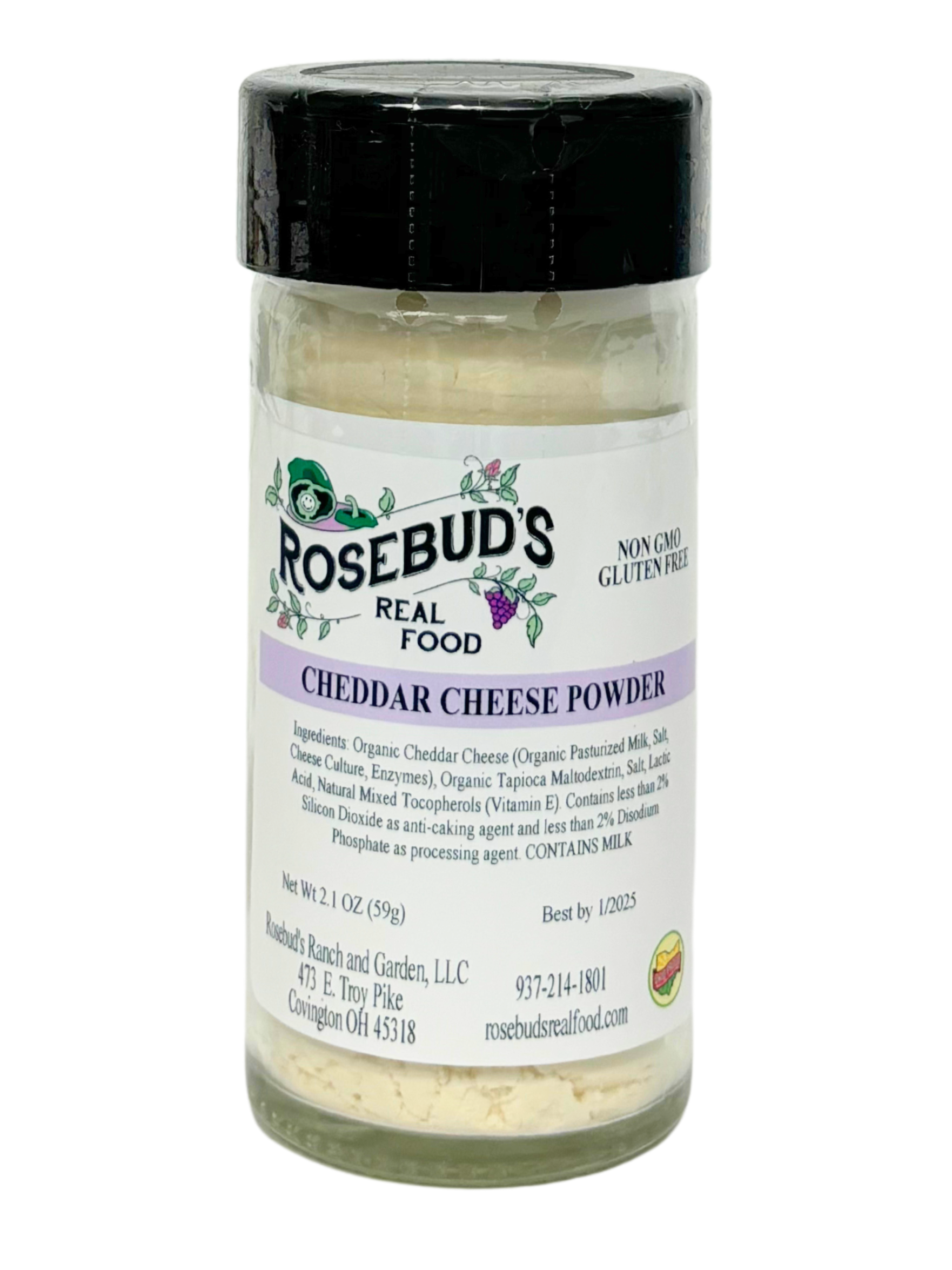 Ingredients: Organic Cheddar Cheese (Organic Pasturized Milk, Salt, Cheese Culture, Enzymes), Organic Tapioca Maltodextrin, Salt, Lactic Acid, Natural Mixed Tocopherols (Vitamin E). Contains less than 2% Silicon Dioxide as anti-caking agent and less than 2% Disodium Phosphate as processing agent. CONTAINS MILK