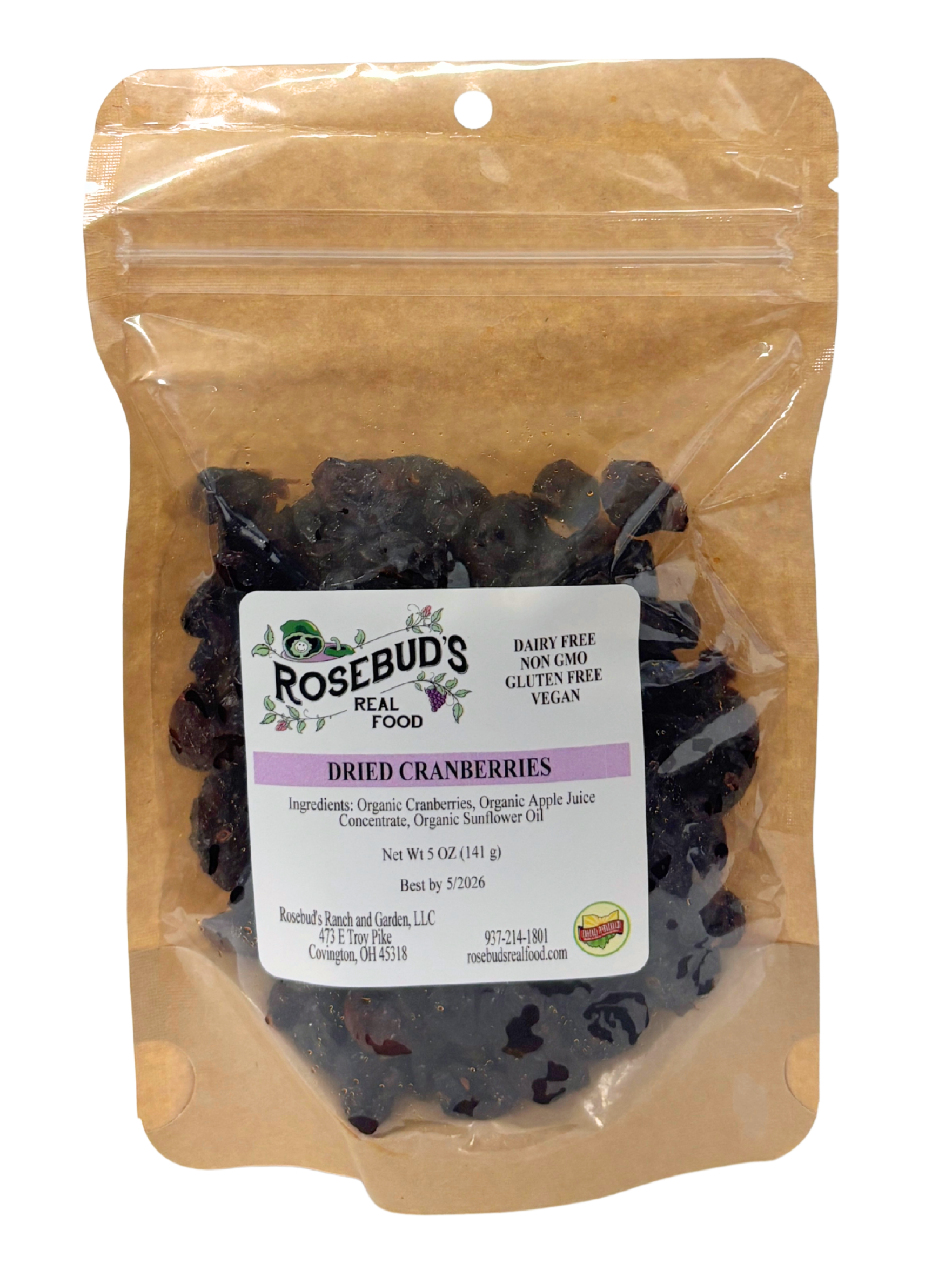 Cranberries, Dried, Juice Sweetened - Ingredients: Organic Cranberries, Organic Apple Juice Concentrate, Organic Sunflower Oil.