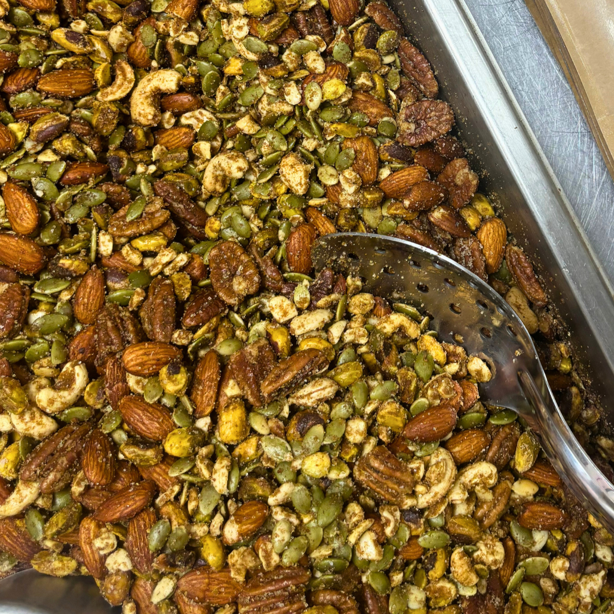 Ingredients: Organic Almonds, Organic Cashews, Organic Pecans, Organic Pistachios, Organic Pumpkin seeds, Organic Cranberries (sweetened with apple juice), Pasteurized Cream, Lactic Acid (contains milk), Organic Coconut Palm Sugar, Organic Evaporated Cane Sugar, Dried Pumpkin, Organic Ceylon Cinnamon, Organic Ginger, Organic Nutmeg, Organic Cloves, Baja Gold™ Mineral Sea Salt, Organic Smoked Paprika, Organic Chili Powder, Organic Cumin, Organic Black Pepper, Organic Garlic, Organic Onion, Organic Sage, Organic Cayenne Pepper, Organic Turmeric, Organic Vanilla Beans
