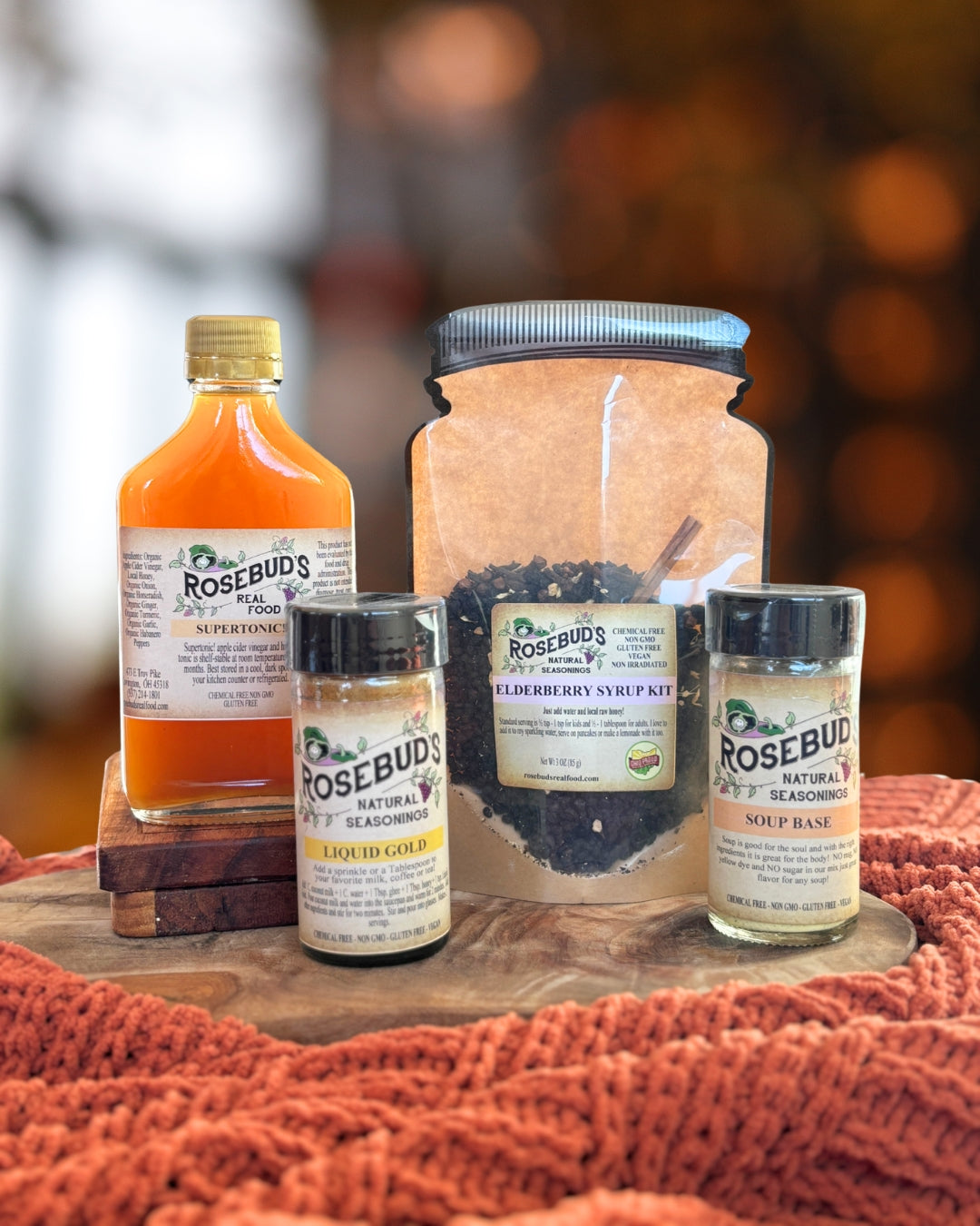 - Rosebud's Supertonic Tonic, Liquid Gold, Elderberry Syrup Kit, Soup Base Seasoning + FREE small packet of Supertonic seasoning!