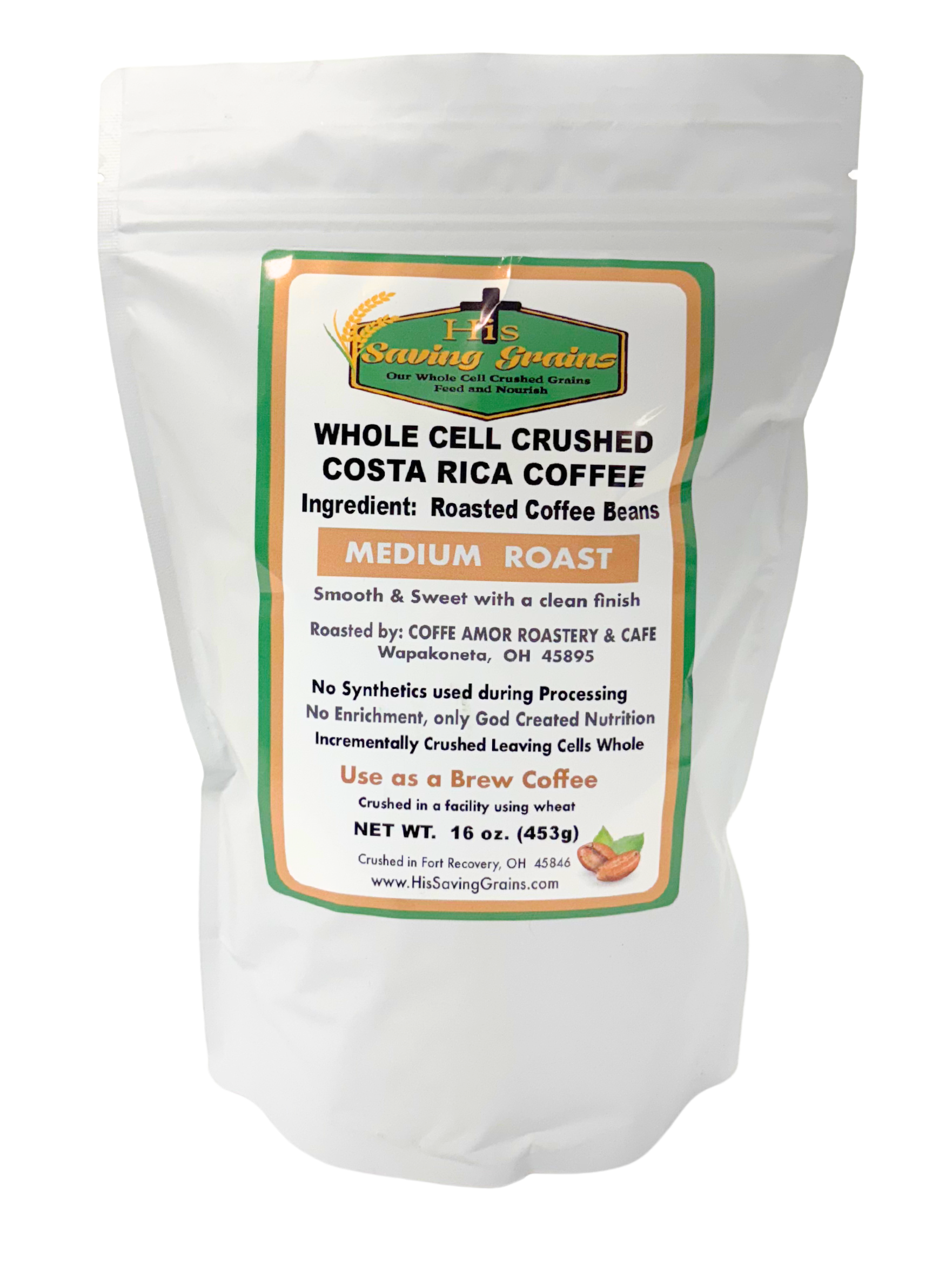 Organically raised coffee, crushed by His Saving Grains.